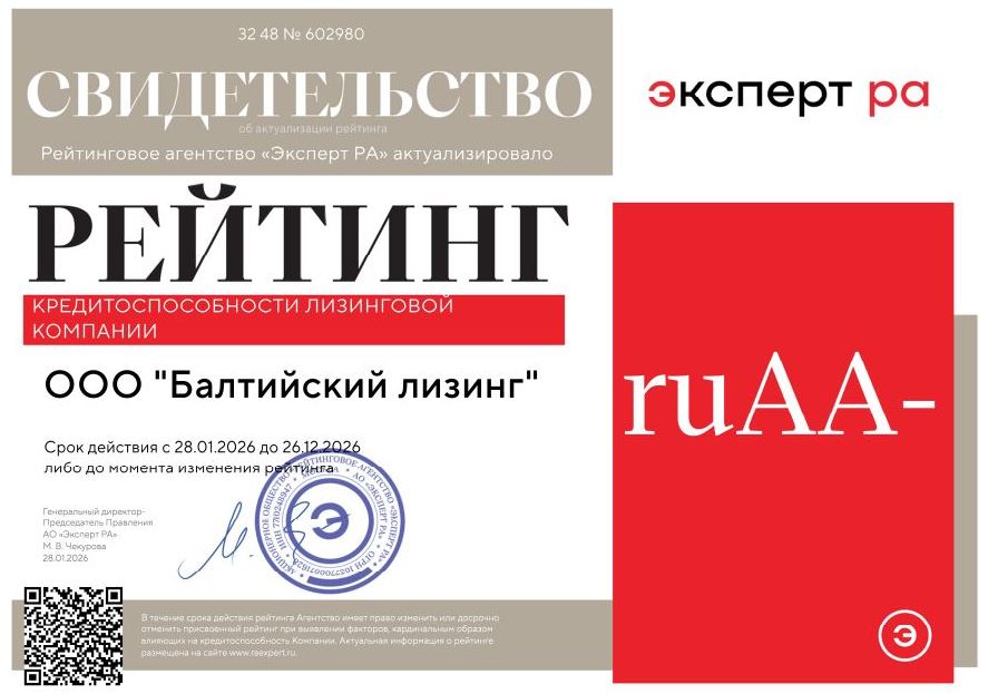 В декабре 2025 года аналитическое агентство АКРА подтвердило рейтинг кредитоспособности компании «Балтийский лизинг» до уровня АА-(RU), прогноз - «Развивающийся».